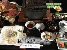 毎朝、浜田で仕入れる新鮮な魚介類と益田和牛を、女将特製の石州瓦の火鉢で焼く「瓦宝楽焼き」は絶品。