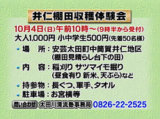 今回は、我らがナベさんと番組初登場の松本裕見子が2人が、稲刈り真っ只中の安芸太田町をぶらつきながら、おいしいご飯をいただこうというあつかましい企画です。 早速、稲刈りをしている人を発見。
