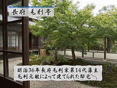 長府毛利邸は、長府毛利家14代当主の毛利元敏公が、東京から長府に帰住し、この地を選んで建てた邸宅で、明治31年(1908)に起工し、明治36年6月2日に完成した後、大正8年(1919)まで長府毛利家の本邸として使用されました。