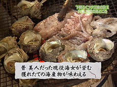 角島灯台のふもとにある店。獲れたて新鮮なさざえ、イカ、なまこなど海の幸を いただける。