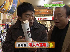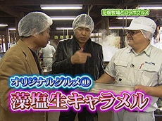 しかし、広島の素材だけで作るのはありきたり。そこで、タレント田中義剛が経営する、生キャラメルでお馴染み「花畑牧場」に依頼し、コラボ商品を開発するプロジェクトをスタートさせました! 熟年だけに「ヘルシーで栄養バランスがよく、元気が出る食べ物。」を!! 早速、広島の食材を勉強するため、田中さんが来広。 まず向かったのは、広島の特産、加工品が揃う「ひろしま夢ぷらざ」。そこで田中さんが注目したのが「海人の藻塩」。ちょっと食べてみたいと、生産工場のある蒲刈へ。1600年前、古代人も作っていたというこの藻塩で何を開発するのでしょうか?