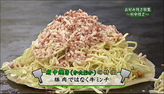 続いて、県内で初めてb-1グランプリに出場した「府中焼き」。府中焼きは、ミンチが入り、モヤシが入らないのが特徴?なぜバラ肉ではなく、「ミンチ」??