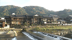 昭和7年創業。国の有形文化財指定。 三徳川沿いに全長120mに渡り佇む古い普請の宿。