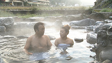 まずは、源泉かけ流しの川原にある温泉に浸かり、商店街「湯の街ギャラリー」巡りへ。