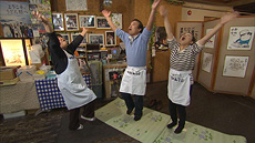松永澄子校長。曲に乗って楽しく手打ち体験!