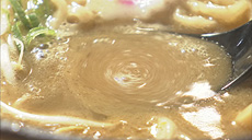 まず、なべさんと松本がやってきたのは、昨年オープンした店。朝さばかれた広島県産もみじ豚のとんこつを寝かせて炊いて、2日かけて作るとんこつ醤油ラーメンのほかに、カツオ節やサバ節、煮干しから取った出汁を加えたとんこつさかな系スープにちぢれ麺が、これまた絶品。