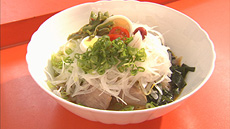 沖縄の離島出身のご主人が作る“冷やし沖縄そば”は、 戦後 物のなかった時代の“おふくろの味”をアレンジしたもの。