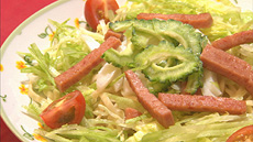 ゴーヤやスパム、沖縄麺を、酢をきかせた素麺つゆにつけながらいただきます。