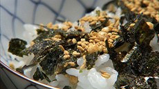 さらに海苔の老舗へ。ここの人気商品はふりかけ。 海苔の切れ端を利用できないかと考え、ゴマを加えてふりかけにしたら、これがもう大人気! パリパリの海苔とゴマの風味がたまらない逸品です。