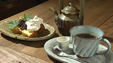 そして「賀茂輝酒造」へ。 酒蔵を陶芸ギャラリーにしたり、精米所を喫茶店にしたりと、工夫がいっぱい。 古民家風な落ち着いた喫茶店では、シフォンケーキが大人気! え?ケーキに吟醸酒をかけていただく??お酒とシフォンケーキの相性は?