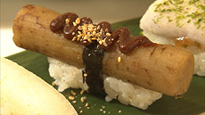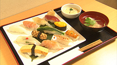 季節の旬のお野菜料理をいただいて、ほっこりとした2人が続いて向かったのは お寿司屋さん。そこのランチを見て、ナベさんビックリ! 魚以外に、冬瓜や里芋など、お野菜のお寿司が!! 食べてみるとその美味しさに二度ビックリ!!