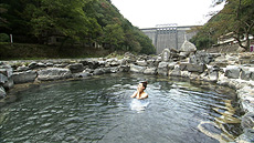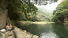 明治に宿坊として開業した茅葺屋根の温泉では、川の景色が望める貸切露天風呂に。 自然に溶け込みながら浸かる、ヌルヌルの湯で癒される二人。