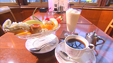 胡子神社前にある老舗喫茶店に入ると、そこはまさに昭和。 高い天井にステンドグラス、そして開店当時からあるプリン・ア・ラ・モードをいただくと 昔にタイムトリップした気分に。