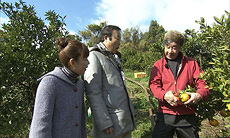 また、Iターンが多いのもこの島の特徴。 Iターン1号の二郎さんの農園にお邪魔した二人。 広い敷地内にはバラ園の他にブルーベリーやみかん狩りなどができる観光農園や ヤギや鶏などの動物も! デコポン狩りや動物とのふれあいを楽しみながら、 東京からきた二郎さんと奥様から田舎暮らしの極意を探ります。