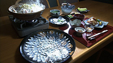 こちらの温泉の自慢がふくのフルコース! 地元の市場にあがる国産とらふぐのみを使用したふく三昧のコースに なべさんと大ちゃんは「幸フク〜」と感激! これを見れば、下関・長府に行きたくなること間違いなし!!
