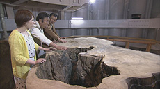 続いては三瓶の“歴史めぐり”。“火山が閉じ込めた奇跡の森”と言われる4000年前の埋没林を、発掘されたそのままの姿で展示してある公園へ。なべさん興味津々!!