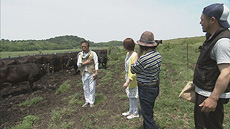 さらに草原で、黒牛たちの一群に遭遇!24時間のんびりと放牧されている放牧牛は三瓶名物のひとつで、赤身の味の濃さと牛肉本来のあじわいに定評があるとか。「来い来〜〜い!」の掛け声で大移動する牛たちに、なべさん・串山、大興奮!!
