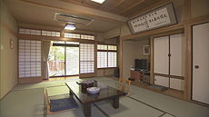 三瓶のお宿は、「国民宿舎さんべ荘」の別館。大小さまざまなお風呂が楽しめる露天風呂で、旅の疲れを癒すなべさん。合流した松本と賑やかに絶品会席膳を囲みます。