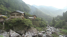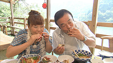 仁淀川の渓谷美を存分に堪能した二人、今回の宿は中津渓谷そばの温泉で。川のせせらぎを聞きながら露天風呂に浸かり、仁淀川沿いの山川の恵みを和懐石で堪能します。