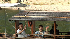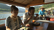 仁淀川とは、愛媛県石鎚山を水源とし、流路延長124km・流域面積1560平方kmの清流で、四万十川・吉野川と並ぶ四国三大河川の一つ。 まずは「仁淀川をもっと知ってもらいたい」と昨年開業した屋形船で遊覧。船頭さんの案内で、鮎や野鳥を見ながら大自然のなか川下り。舟では「仁淀川弁当」をいただきます! そして川で何やらカゴを引き上げる漁師さんを発見。そのカゴには8月解禁の「つがに」が。 早速川辺の料理屋で「つがに汁」に「つがにソーメン」等「つがに」三昧いただきます!