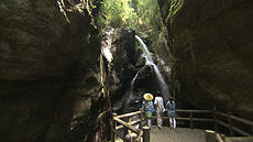 青く見える場所は「荒男谷」「乙女河原」。高さ30mの豪快な滝「飛龍の滝」も。