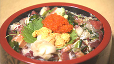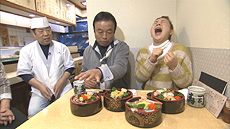 続いて向かったのは、父から伝授されたシャリの味を守り続ける2代目と、その息子さんの3代目が切り盛りするお店。出てきたランチは何と海の幸がたっぷり乗った豪華チラシ寿司!そのボリュームに2人はビックリ!!さらに、継ぎ足しながら使うダシで煮込んだ名物「地アナゴの巻きずし」も登場!!