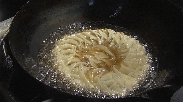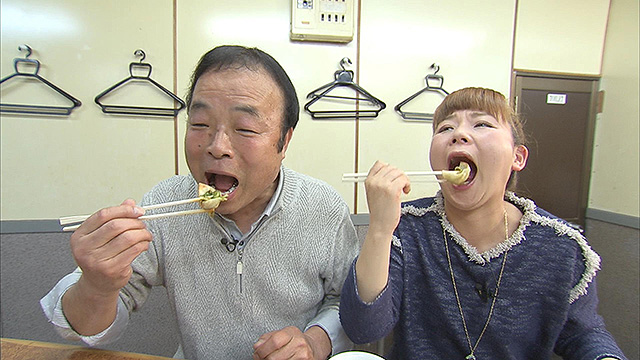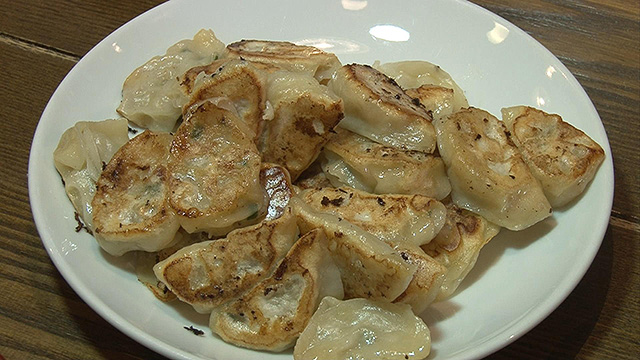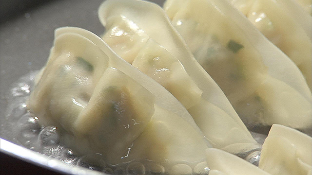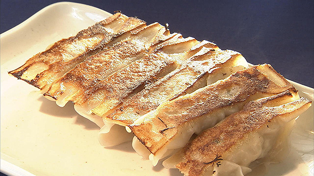 包む餃子は1日なんと1,000個!まるで芸術作品のような波打つ餃子は作り置きせず新鮮なまま、なんと水と油を同時に入れる"蒸し揚げ"にする秘伝の味。夫婦二人三脚で営む老舗の愛情餃子とビールで、なべさんたちご満悦!!