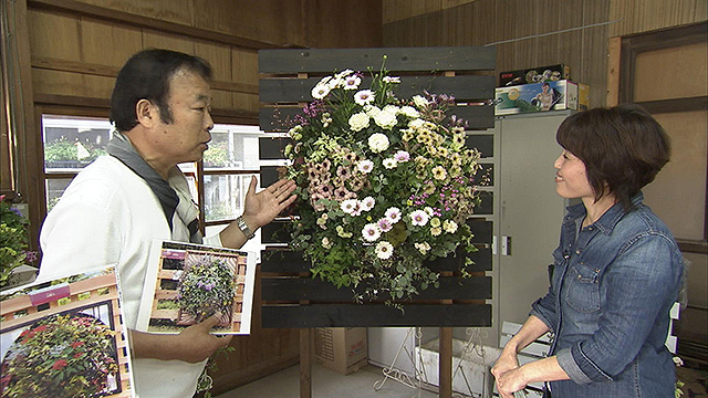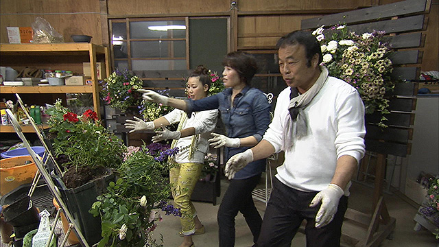 福山市赤坂にある「KIT*花工房」、2人はそこでハンギング教室をひらく元教師の奥様に手ほどきを受けてハンギングに挑戦。こちらの奥さん、なんと初めて参加した関東のコンテストで金賞を受賞した、驚くべき才能の持ち主!ふたりの出来栄えやいかに・・・?