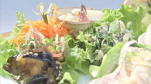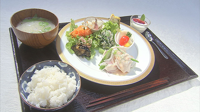 最初になべさんと松本が訪れたのは、自家製の野菜や米をふんだんにつかった料理が楽しめる農家カフェ。色とりどりの美しい料理と、よく笑う働き者の奥さんの人柄に感激!