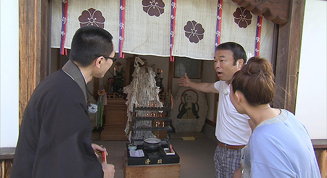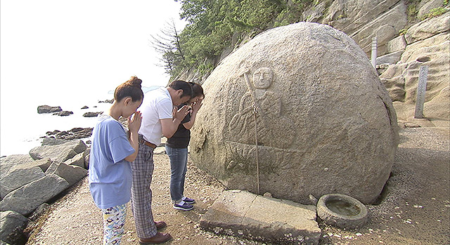 つづいては因島へ。やってきた浜辺には大きな丸い岩?!裏側に掘られたお地蔵さまの悲しい逸話とは?続いて訪れた由緒ある神社に祀られるご本尊はまるでミノムシ!?なぜこんな姿に??ご利益を求めてなべさん、あるお願いを・・・。