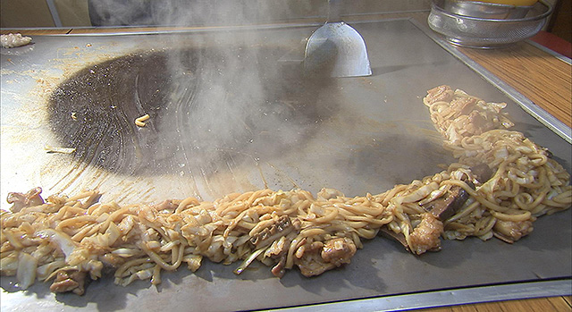 さらに、かつて造船城下町として賑わった商店街・土生商店街を巡るとレトロな街並みの一角に超渋い焼肉屋を発見!年季の入った鉄板には大きなくぼみが?客席の鉄板にも無数の穴が??それは造船の島ならではの店主のアイデアだったのです。70年間継ぎ足しダレでいただく名物「ホルモンうどん」に二人ともおなか一杯!