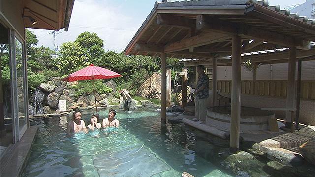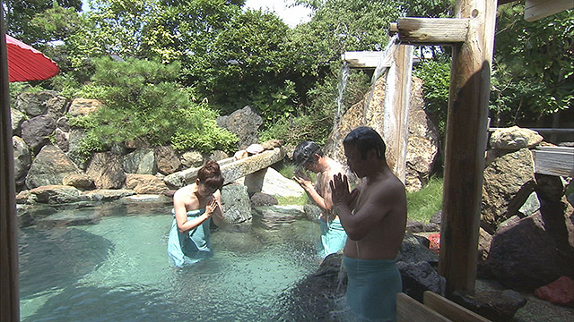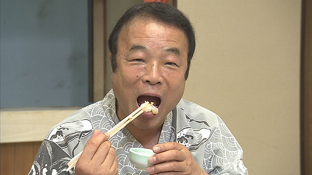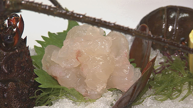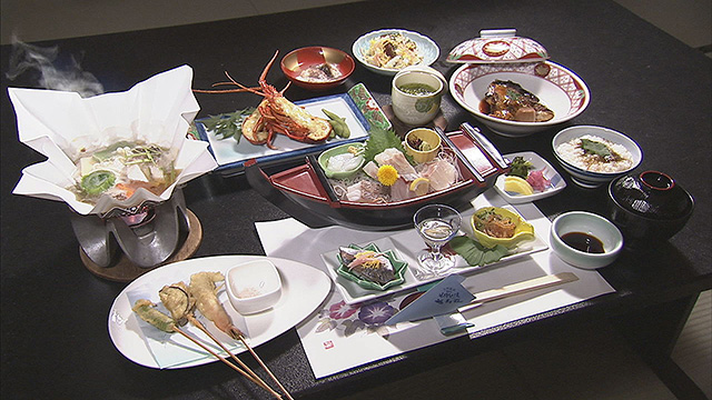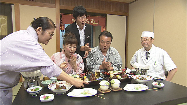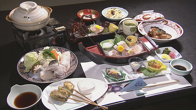 そして、今回のお宿は「福寿荘」。温泉で疲れを癒し、お待ちかねの食事へ。ここで2人は、ここぞとばかりにワガママを連発。ただでさえ豪華な会席が「三重ブランド」尽くしの超豪華会席にグレードアップ。的矢カキの天ぷらをはじめ、伊勢海老は姿作りに!そして極めつけは、天然のとらふぐ=安乗ふぐの鍋に雑炊も登場。ナベさん思わず・・・「伊勢の人は威勢がいいなあ...」なんて(笑)