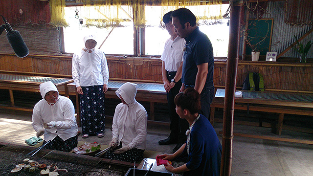 2日目の朝は、真珠とカキの養殖で有名な英虞湾を一望できる「横山展望台」から。その絶景を堪能した後は、女性の願いならひとつは叶えてくれるという「石神さん」へ。女性の職業である海女さん仕事の無事を祈ってお参りする神社だったことから有名になったとか。そして、昼食はその現役の海女さんの話を聞きながら、新鮮な魚介類を炭火で焼いて食べることができる場所へ。海女さんたちが休憩をする海女小屋を利用したこのスポット。なんとウニ飯は食べ放題。至れり尽くせりです。