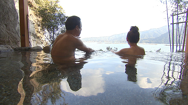 最後になべさんと松本は、新しく温泉が出来たという噂を聞きつけて「安芸グランドホテル」へ。その絶景露天風呂に2人とも仰天!そして湯あがりに至福の料理の数々をいただき、熟年大満足間違いなし!