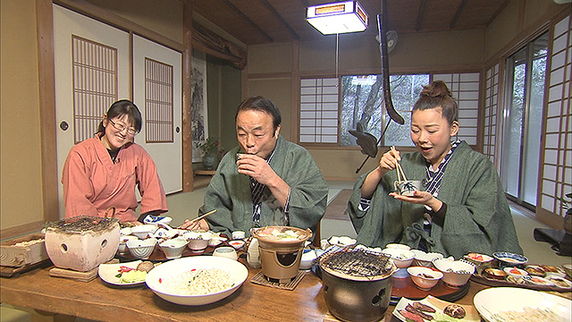 まずなべさんと松本が訪れたのは、福山市にある龍頭温泉。渓流沿いにたたずむ隠れ家感満載の「龍頭温泉 川の音」で、川のせせらぎを聴きながら極上檜風呂を堪能したあとは、旬の食材をふんだんに使った懐石料理をいただきます。
