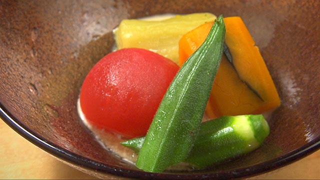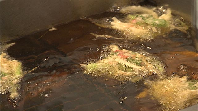 新鮮野菜を使った日替わりの料理は熟年女性に大人気。数々の野菜料理に目移りする2人。そして、野菜の天ぷらを目の前で揚げてくれるのもうれしい限りです。