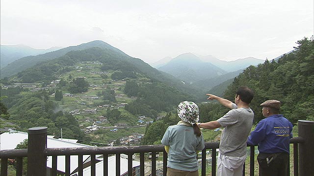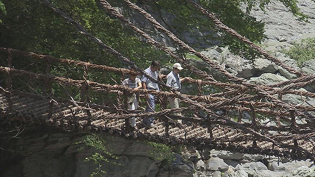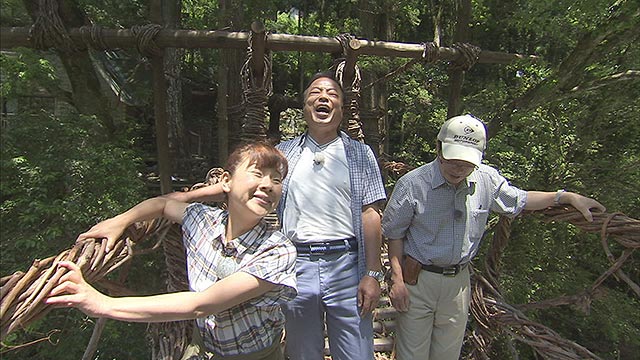 さらに、通称・奥祖谷といわれるエリアを訪れた2人。ここではまず、昔ばなしの世界のような風景がひろがる落合集落へ。高低差390メートルの急斜面に古民家が張り付くようにして建ち並び、まさに"日本の原風景"に心なごみます。その奥祖谷には、実は二重かずら橋なるものも!そして、その近くには"野猿"と呼ばれる人力ロープウェイも。