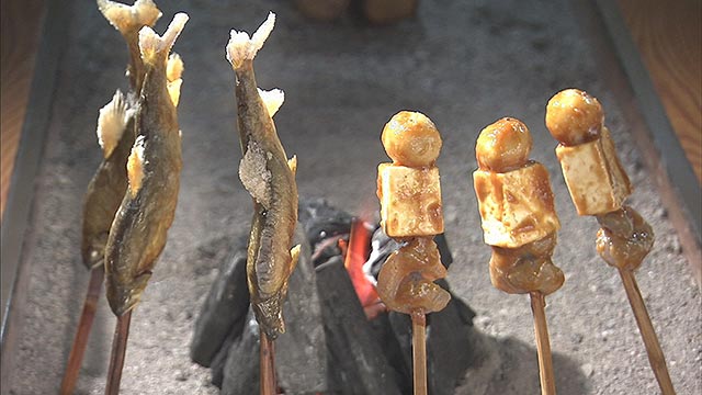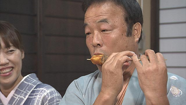 そして、今回のお宿は、かずら橋近くにあるお宿。この宿は専用ケーブルカーを使って移動する天空の露天風呂が自慢。開放感いっぱいの湯船で癒やされたあとは、お待ちかねのお食事。山と川の幸がてんこもりの郷土料理に、どこか懐かしさを感じる2人なのでした。