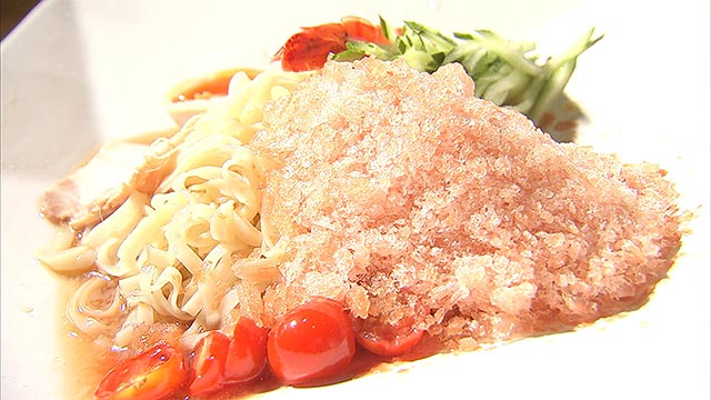 一方、大ちゃんは夏にぴったりの麺を求めて、広島市の安佐南区へ。うかがったのは馬肉ラーメンという変わった麺を提供するお店。本場・熊本から取り寄せた馬骨を使ったスープに、思わず大ちゃんも「ウマ!」なんですが、こちらの夏季限定麺は、なんと凍らせたトマトを使うんだとか・・・。名付けて「氷結トマト呉冷麺」。体の芯からクールダウンしたい人にぴったりな一品でした。