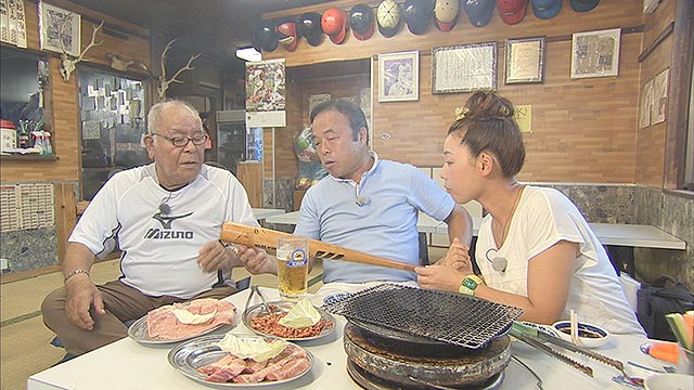 なべさんと松本、最後はかつて、中区中広にあった焼肉のお店へ。こちらのオーナーは大のカープファン。そのオーナーの人柄にひかれ、数多くのカープ選手が通ったお店です。オーナーが見せてくれたのは、なんと衣笠さんが連続試合出場の世界記録を達成した日に自ら持ってきてくれたというバット。驚きのお宝です。