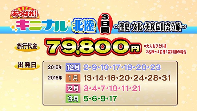 大好評企画・番組オリジナルツアー第9弾「あっぱれ!キニナル 北陸3日間」です。今回は、北陸新幹線も開通し今、大注目のスポット・福井&石川&富山をめぐるバスツアーの全貌を一挙、公開します。