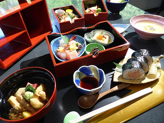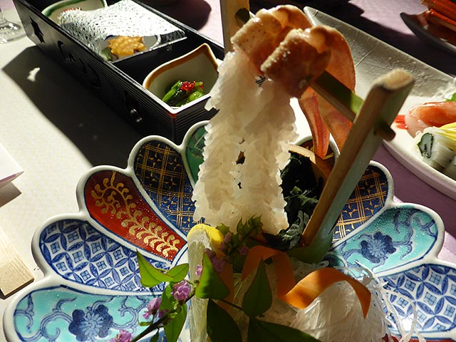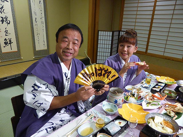広島から、新幹線と特急を乗り継いでまず向かったのは福井県。1日目の昼食は、お豆腐の創作料理。地下100メートルからくみ上げる美味しい水を使ったこだわりのお豆腐に早速大満足の2人。曹洞宗の大本山である永平寺や朝倉氏の栄華の名残を残す一乗谷の遺跡もめぐります。その後、石川県加賀温泉郷にある山中温泉の旅館へ。ここの売りは渓流沿いにある野天風呂。川のせせらぎを聞きながら癒やしの時間を満喫できます。そして、お料理は「カニづくしの会席」。ここぞとばかり、ワガママを言ってグレードアップしましたので、是非お楽しみに!