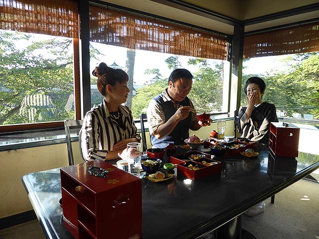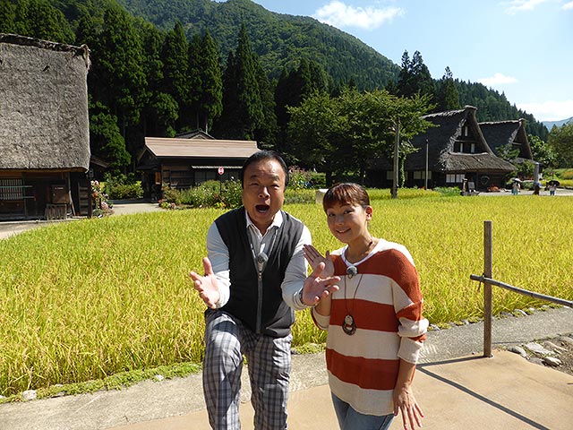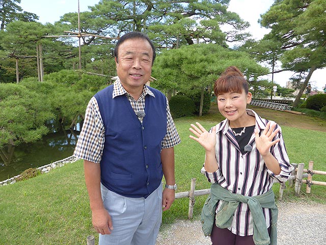 そして、2日目は加賀100万石の城下町・金沢の町を観光。日本三名園のひとつ、兼六園を散策した後は、その兼六園の入り口そばにある茶屋で昼食。冶部煮やゴリの佃煮など郷土料理をいただきます。なべさんを軽くあしらう女将の振る舞いにも注目です。その後は、江戸時代創業の老舗のあめ屋さん、そして、今でも夜には、華やかなお座敷が繰り広げられる、ひがし茶屋街へ。ここは、国の重要伝統的建造物保護地区に選定され、かつての華やかな風情をそのまま残す場所。その中でも一番大きな茶屋で独特のお茶屋建築を見学し、金粉入りのお抹茶でちょっと一息。実は、金沢は金箔の生産で日本のほぼ100%を占める町。茶屋街では金箔貼り体験も行います。職人さんの、熟練された技にびっくりの2人。その技を邪魔するなべさんの行動に爆笑してください。2日目の夕食は、バスガイドさんおすすめの富山のブランド牛「氷見牛」の特選セット。カルビはもちろん、モモでもとろけるような口当たり。ガイドさんの軽妙な食事リポートも必見です。