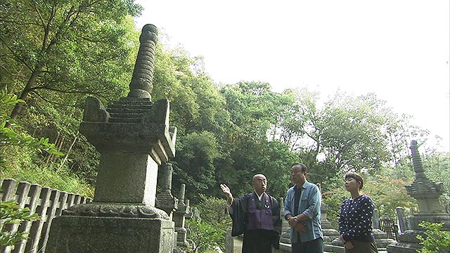 次に訪れたのは、小早川家ゆかりのお寺。初代実平から17代の隆景までの墓20基に、源頼朝の墓と言われているものも・・・。墓前をよく見ると、「平」の字が。これには深い意味が隠されていました。さらにお寺の宝物館の更なるお宝に2人は驚きの連続です!