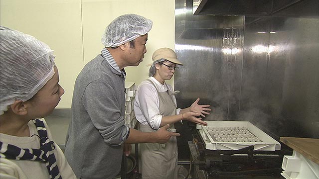 続いては、出張販売で人気のギョーザ店へ。ここの餃子は、すべて広島産の素材にこだわった一品です。さらに珍しい蒸し餃子、あまり食べる事のない味に2人は感激!こだわりの肉まんや角煮まん、ジューシーなシュウマイも登場します。