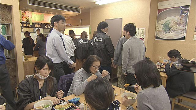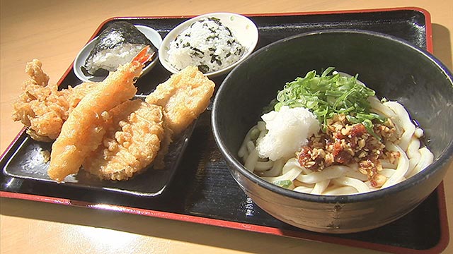 なべさんと松本がまず向かったのは、本場・讃岐うどんのお店で修業した店主のセルフうどん店。お昼時はサラリーマンで大賑わいのこのお店。500円あれば、うどんに天ぷら、おむすびと、十分に満足できるんです。家族みんなで営むアットホームな雰囲気に思わずほっこりしちゃいます!