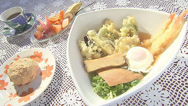 お次は山と畑に囲まれた、三原市内にあるうどん屋さんへ。うどんに入れる野菜は、旬のものは自家栽培しているのだとか。山盛りになった天ぷらうどんにびっくり!自家製のおはぎやフルーツ、珈琲も付いて○○○円!?お得すぎるそのお値段に二人ともびっくり!