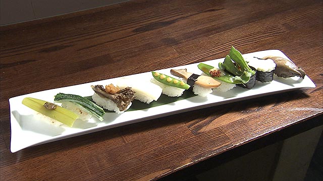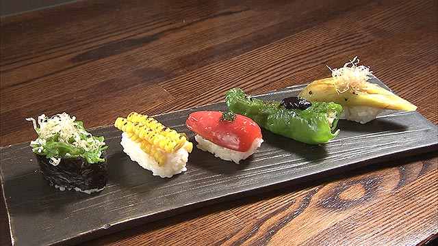 県内産の朝採り野菜で作るのは、彩り鮮やかな野菜寿司。「広島野菜寿司 きずな屋」では、一貫一貫味を変え手間ひまかけたアイデア寿司を提供。