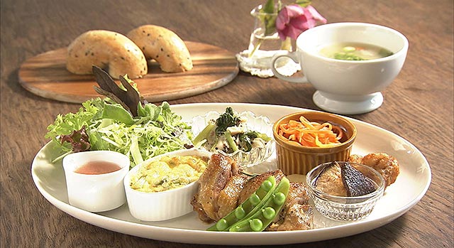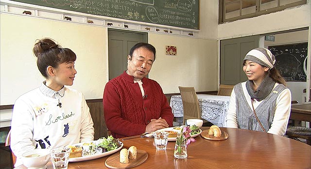 2人が最後に向かったのは、大自然に佇む廃校を利用した「森の小さな小学校 まなびやcafe」。庄原産の旬の野菜で彩られたプレートランチに舌鼓。