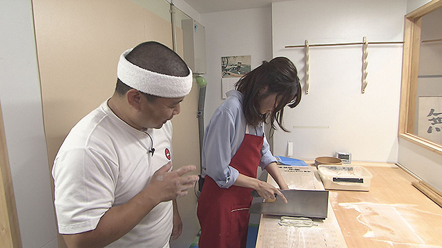 とうかさんのすぐ近く、流川通りで見つけたのは彫刻刀の専門店。神社の彫刻も手掛けるという2代目の職人技を拝見し、ナベさんは彫刻を体験!